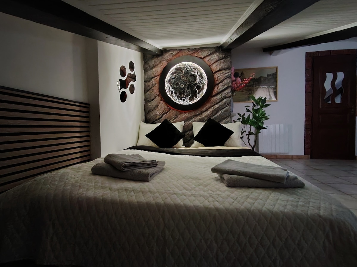Alojamiento insólito en el ambiente «hobbit» enclavado en el fondo de un jardín salvaje con vistas a la ciudad. Se accede a través de una ruta de senderismo (empinada). El alojamiento consta de una sala de estar con chimenea, una pequeña cocina, una alcoba para el dormitorio, un pequeño baño, una terraza con vistas al valle y la ciudad (a 1 km), y novedad, un baño calentado con leña (excepto en verano) Hay velas y música disponibles para crear ambiente ¡Ideal para una estancia romántica o un momento fuera de temporada!