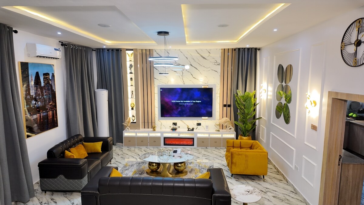Welcome to TD Luxury Suites, where luxury meets convenience in Lagos. This stylish 4-bedroom apartment offers 24/7 electricity, fast internet, and chic decor for a sophisticated stay. With 24/7 security in a gated estate, you can relax after exploring nearby attractions like movie theaters, shopping malls, restaurants, and bars. The overall decor exudes a trendy and sophisticated style, creating an inviting atmosphere that's perfect for unwinding after a busy day exploring the vibrant city.