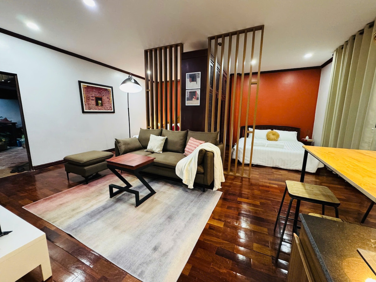 Acogedor departamento con servicios totalmente amueblado ubicado en el centro de la ciudad. A poca distancia de cafeterías, restaurantes, mercados nocturnos, pubs, etc. El mantenimiento diario de la casa se proporciona de lunes a sábado. Estamos en el mismo edificio que Kiriya Cafe, justo enfrente del templo Inpeng. Esta unidad está en el primer piso del edificio, por favor infórmanos de tu hora de llegada y habrá alguien que te ayude con el equipaje.