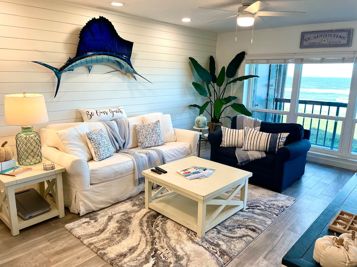 BEST spot to watch the sunrise, (and moonrise) on St Augustine Beach from every room in the condo and from the two direct beach front balconies! CORNER UNIT! TOP FLOOR! One balcony off the upstairs corner primary bedroom suite, walk in closet and ocean view King size beds in each bedroom. Anytime is a good time to be on the beach in St. Augustine! Winter Spring, Summer, or Fall! Besides being steps from the beach there are plenty of local eateries,great food, live music within walking distance.
