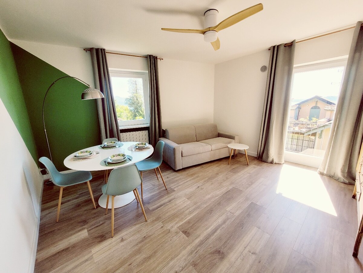 Apartamento de dos habitaciones con vistas panorámicas en una elegante casa multifamiliar rodeada de un parque con la vegetación típica del lago. El apartamento tiene todas las características para que tengas una estancia agradable: es muy cómodo, luminoso, cuidado, bien amueblado y limpio. Su punto fuerte es, sin duda, la terraza con espléndidas vistas al lago y a las islas.