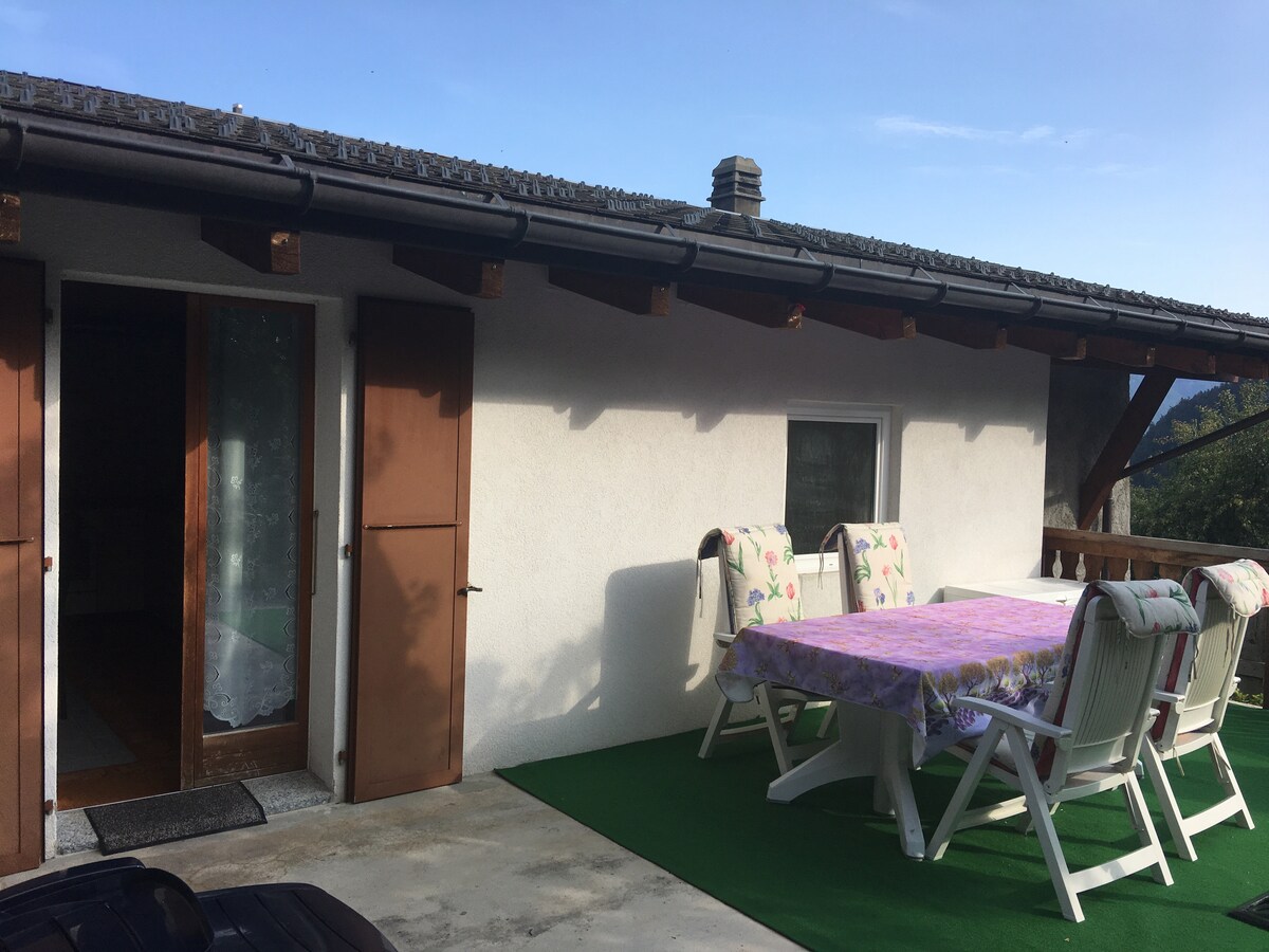 Get a change of scenery and come and discover our beautiful mountains. On the lower floor of the chalet, we offer a very nice apartment. It includes a bedroom with a double bed and an extra bed, a bathroom with a large shower, a small and well-equipped kitchen and a living room with TV. On the ground floor a furnished terrace with breathtaking views of the Alps, located due south, on the edge of the forest, very quiet.