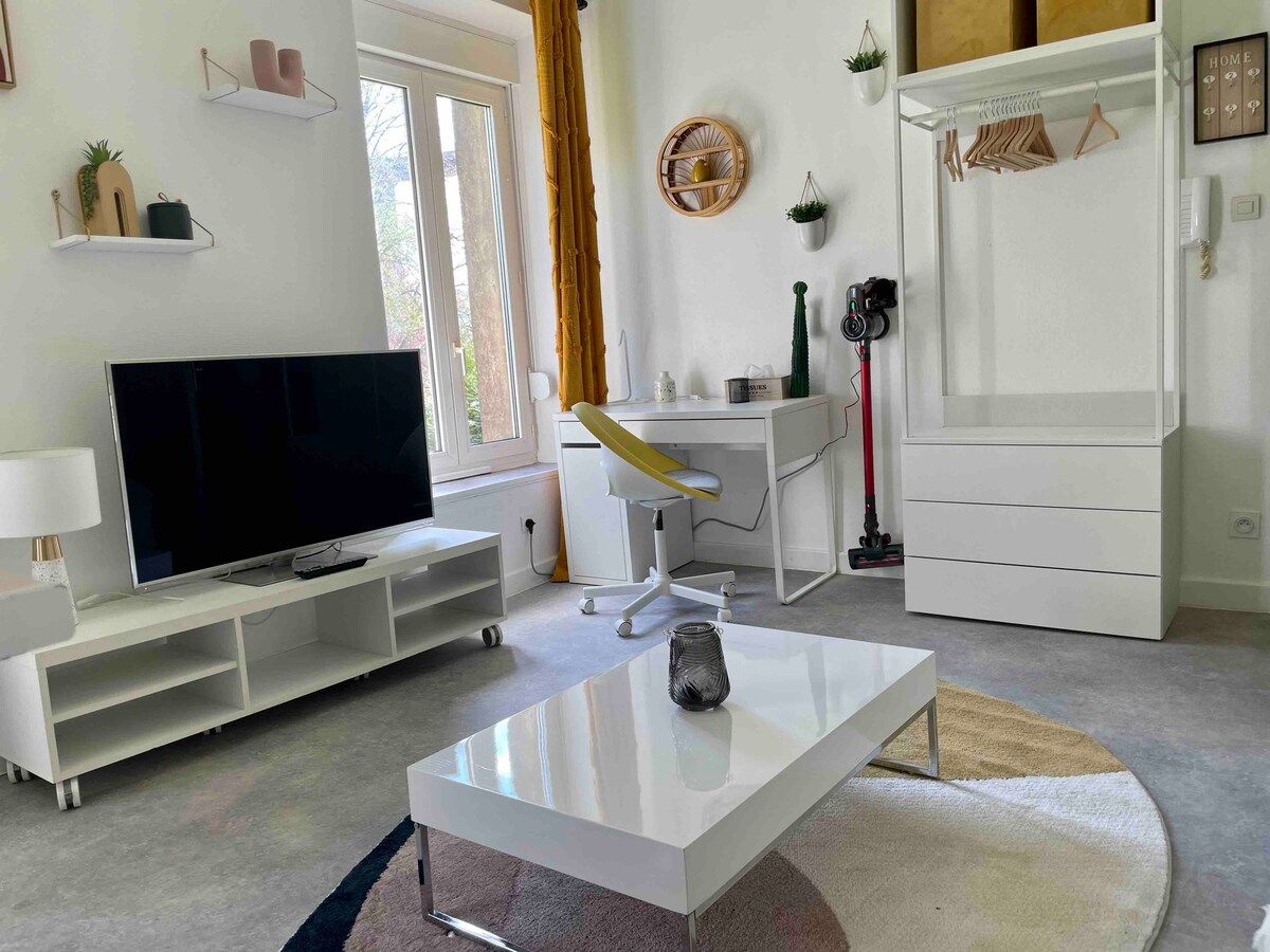 Petit studio au calme situé à 15 minutes de la gare de longwy à pied (train direct vers Luxembourg). Tout équipé il conviendra à de courts ou moyens séjours . Idéal pour une personne mais peut convenir pour deux personnes (courte durée). Un parking est disponible gratuitement devant l’immeuble, l’arrêt de bus se trouve également juste devant. Situé en rez de jardin il est calme car il ne donne pas sur la rue. Un accès au jardin peut etre possible sur demande.