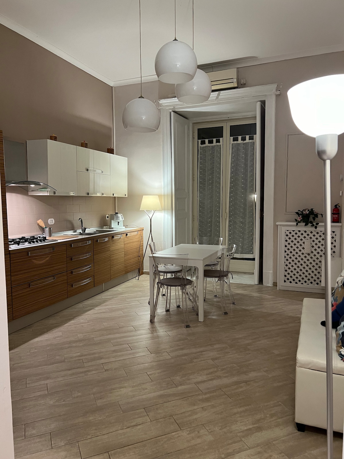The apartment, just a 3-min walk from Amedeo Square (Metro L2, Funicular, Taxi Station), can host up to 5 guests and provides all the comforts for a relaxing stay in the heart of the elegant Chiaia district. The main spaces are: two cozy bedrooms with ensuite bathrooms, a spacious sitting room with a sofa bed, and a bright dining area with a handcrafted kitchenette. The interiors feature Liberty-style wood doors and frames from 1909, harmoniously balancing rustic elegance with modern amenities.