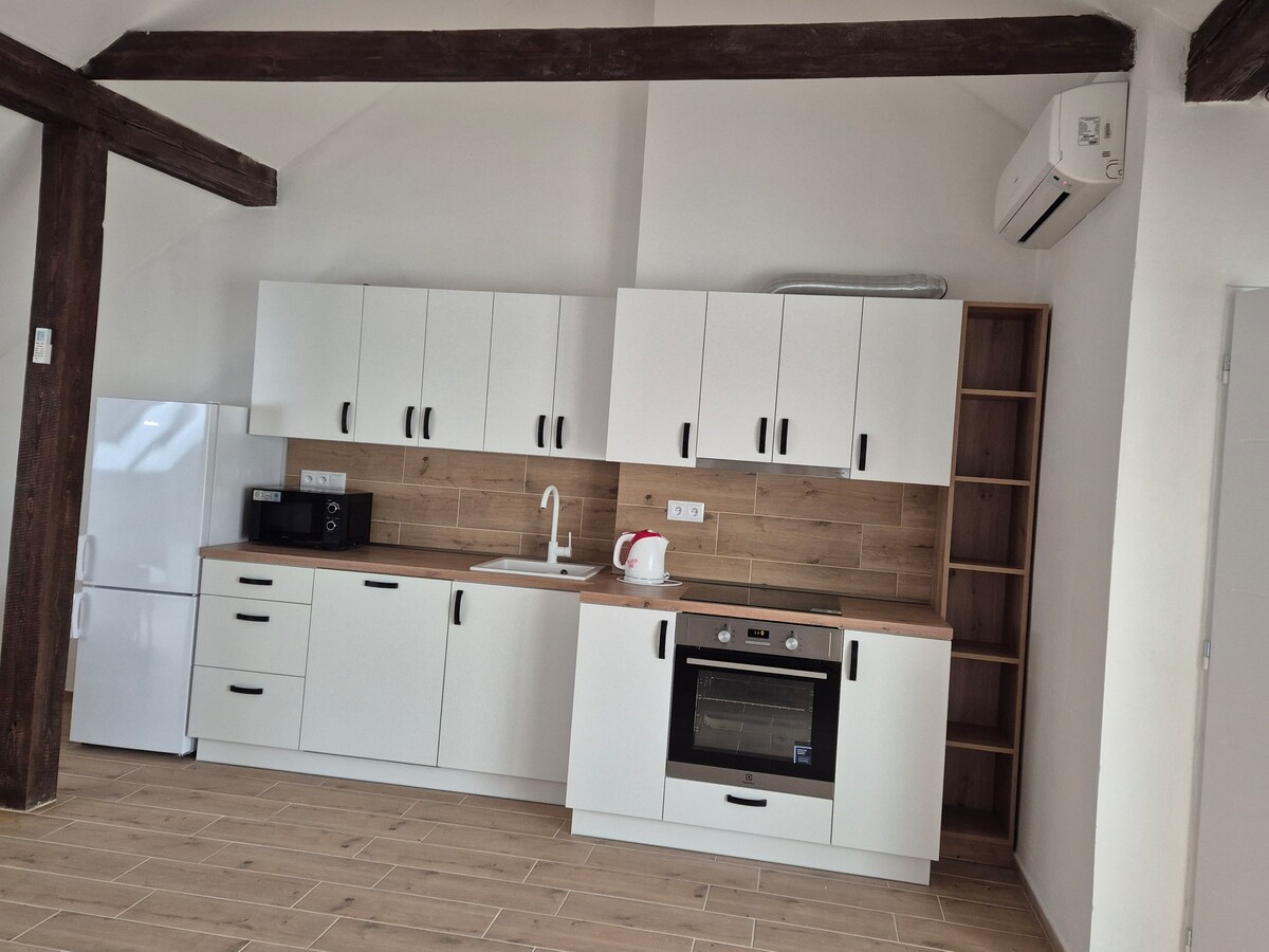 Apartman v patře o velikosti 2kk. Obývací pokoj s vybavenou kuchyní, koupenou s wc, ložnicí a mezonetovým spaním. Nachází se v rodinném domě o 3 apartmánech, kousek od centra poklidného městyse Kralice na Hané. Pračka, smart TV, wifi a terasa s grilem pro naše hosty jsou samozřejmostí. klimatizace za příplatek
