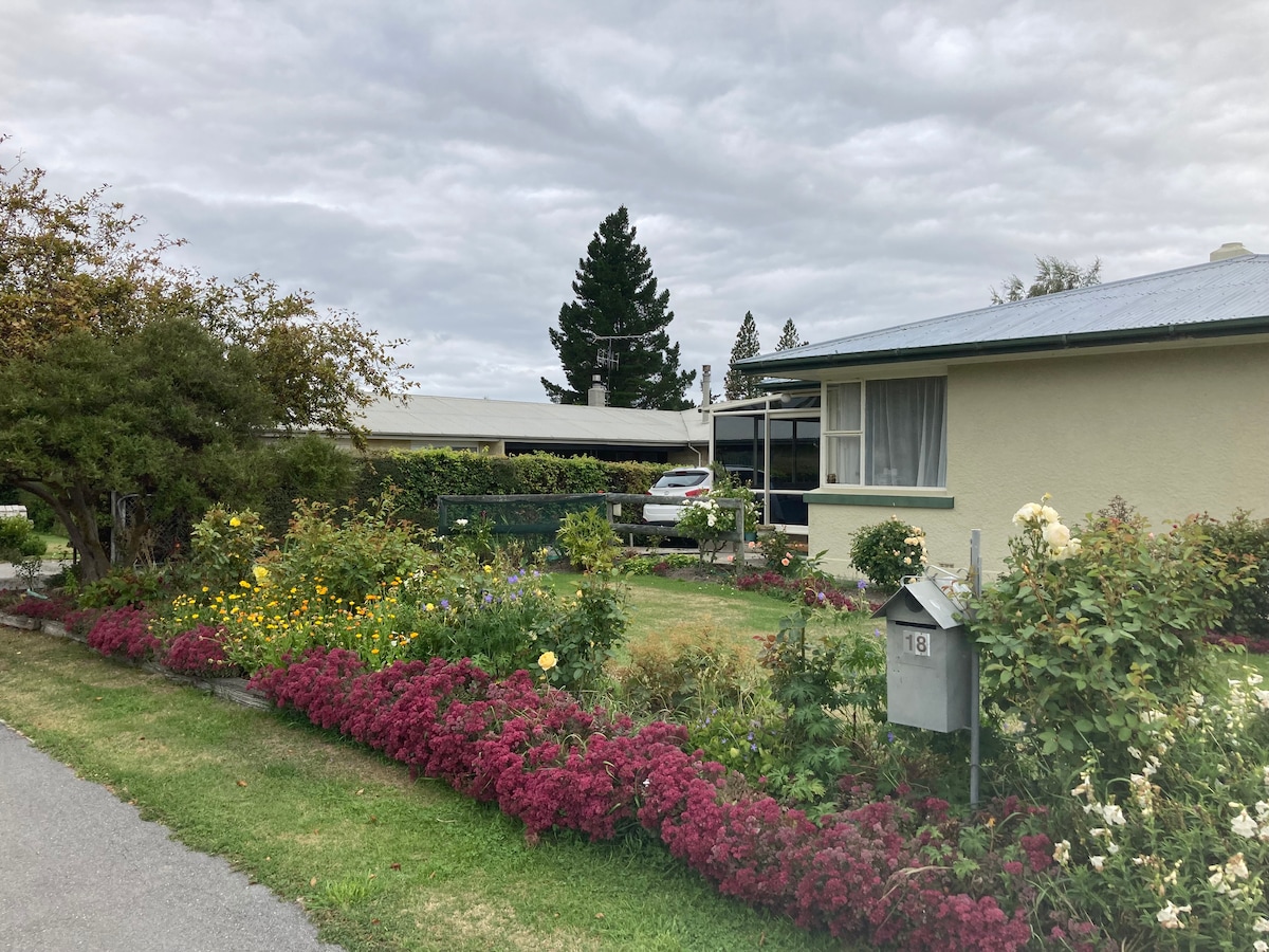 Peak View Apt, (haz clic en fotos para ver pano) Nuestro apartamento está unido a nuestra casa, hay estacionamiento gratuito, tiene una pequeña cocina con microondas, freidora de aire, freidora eléctrica, wifi de cortesía, calefacción y aire acondicionado, una cama doble con baño privado (ducha, inodoro, lavabo, secador de pelo). Tranquilo, relajado, moderno, a pocos minutos del centro de la ciudad de Twizel, senderos para bicicletas, el lago Ruataniwha, la pesca de truchas y salmones para peces monstruosos en los canales durante todo el año o los ríos locales durante la temporada de pesca de verano.