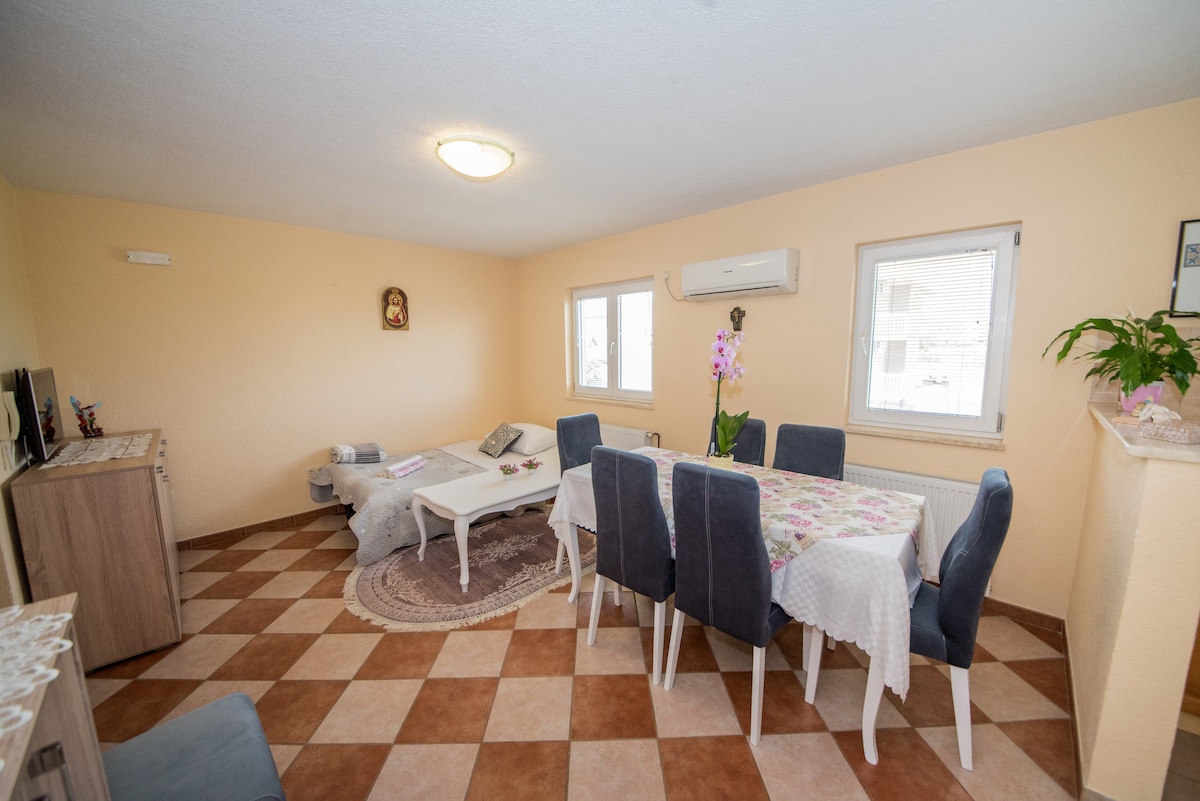 Una villa clásica de gestión familiar con ocho apartamentos 4+1 a 5 minutos a pie de la iglesia de Santiago y el centro de Medjugorje. A 7 minutos a pie de Apparition Hill (Mt. Podbrdo). Situado en un barrio tranquilo, en las inmediaciones de campos de viñedos y montañas. Katarina y Anthony viven en la casa y están ahí para ayudar a sus invitados de cualquier manera.