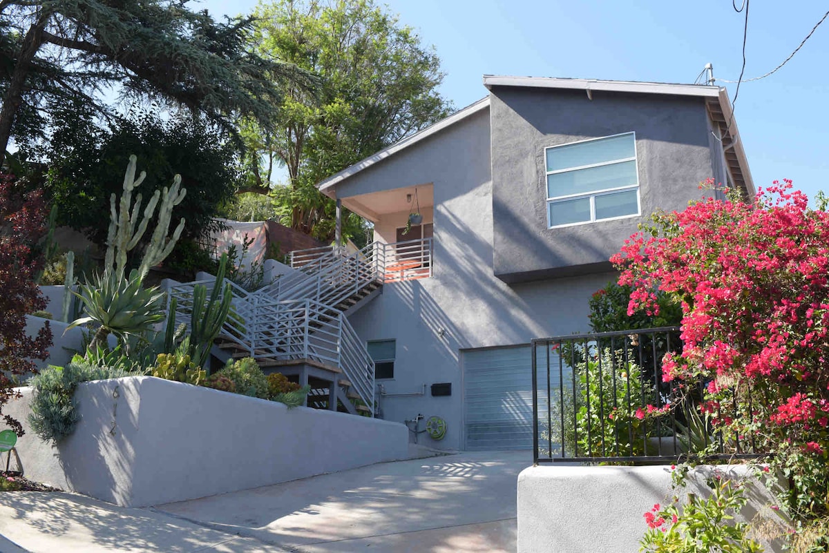 Moderna casa de mediados de siglo con 2 dormitorios/2 baños con vistas espectaculares sobre Sunset Strip (a 2 manzanas de Hollywood + Fairfax). A solo unas manzanas de la acción, pero muy privado y tranquilo. Renovaciones recientes desde el techo hasta los cimientos, sistema de calefacción/aire acondicionado, wifi de 1 Giga/seg, cableado de entrada y salida con 11 altavoces, proyector de cine + dos televisores 4k (Netflix gratuito, HBOMax y AppleTV+), estacionamiento para 2 coches con cargador eléctrico de nivel 2. Nota: No se permiten reuniones sociales ni noches ruidosas hasta tarde. Interior = 1015 pies cuadrados. Cubierta = 300 pies cuadrados.