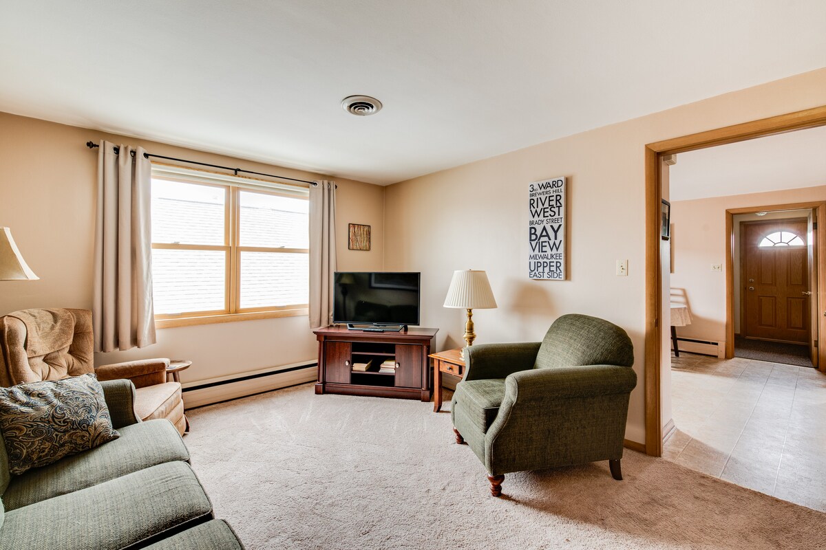 Unwind in this serene and charming upper unit crafted for comfort in style. It features a king-sized bed, a Twin XL bed and a pullout sofa, ideal for cozy Movie nights.The backyard offers a perfect space to hangout. Conveniently located near Milwaukee's attractions, you're just 1.7 miles from American Family Field/Brewers Stadium 2.3 miles from State Fair Park 5.5 miles from Fiserv Forum/Downtown 6 from the Lake Enjoy Wi-Fi, self check-in, keyless entry and free parking for 1 car