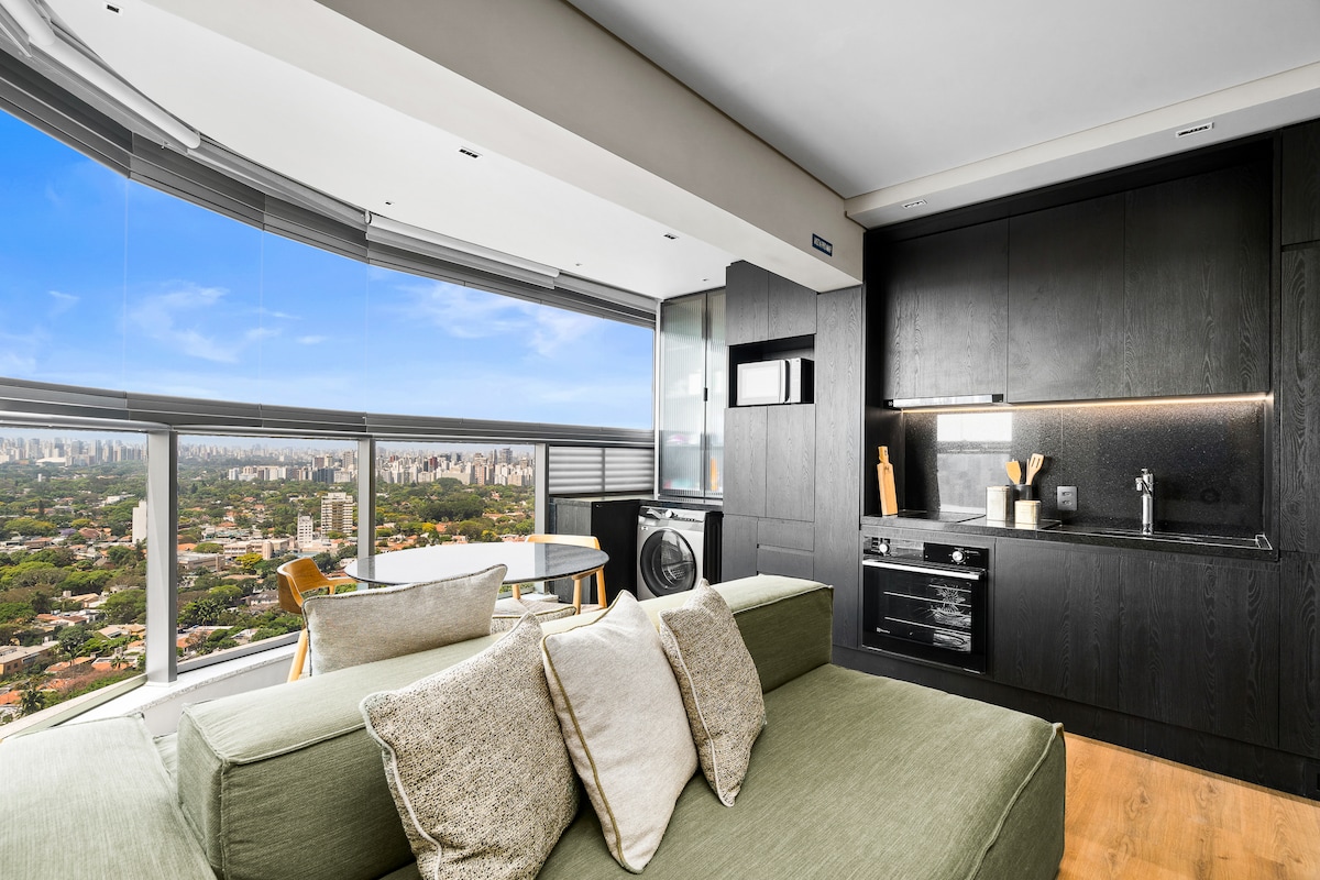 Apto studio Novo, en un piso muy alto (piso 33). Vista de 180 grados para el horizonte de São Paulo. Área de juegos completa en el piso 20 con piscina infinita, carril de natación, sauna seca, gimnasio de alto nivel, sala de pilates. Mercado y lavandería disponibles en el condominio. Fácil acceso a Shopping Eldorado, Faria Lima, Paulista y Centro. El metro Butantã está a 6 minutos a pie.