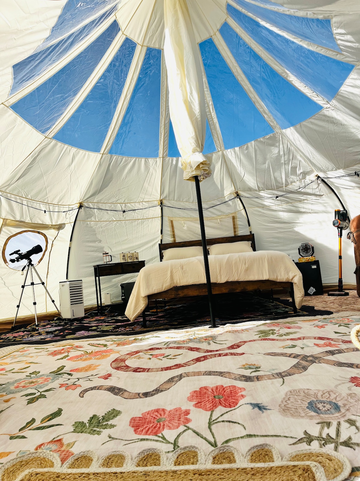 Marshmallow Retreat Rentals ✨ Telescope Nights at the Astral Tent ✨ Sleep beneath a clear ceiling and drift off under a sky full of stars in our unique Astral Tent, perfect for up to 6 guests. Inside you’ll find a queen bed, queen-size sofa bed, and two cozy futons. Enjoy a telescope for stargazing, hammock sunsets, hot Camplux shower, outdoor bathroom, fast Starlink WiFi, grill, fire pit, mini fridge, swamp cooler, and propane heater—your cozy desert escape. 🌌
