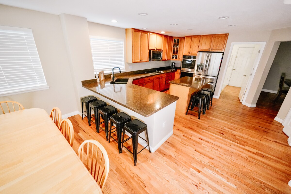 Amplia propiedad: amplio espacio para todo el grupo: iluminación brillante, decoración divertida, patio trasero cerrado, muebles modernos. 8 dormitorios (4 camas tamaño king, 3 queen, 3 camas individuales), 4 baños completos, 2 cocinas con electrodomésticos modernos, amplios asientos y cómodos sofás. Disfruta de un comedor al aire libre, chimenea, parrilla eléctrica y asientos adicionales. Ideal para huéspedes adicionales, reuniones corporativas, reuniones familiares o eventos de equipo. Ubicado en un barrio vibrante con fácil acceso a parques, atracciones locales y las principales atracciones cercanas.
