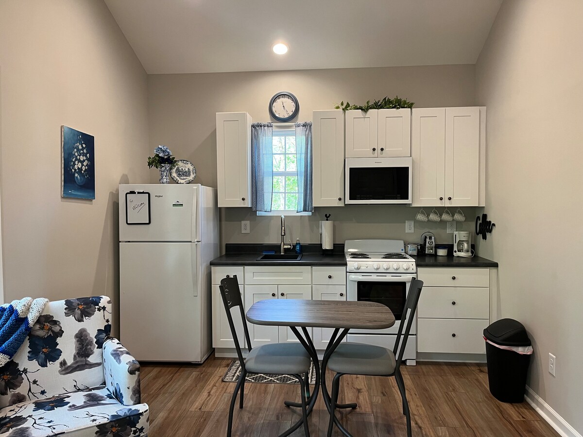 ¡Ven a quedarte un rato en esta adorable casita de campo! Es una construcción completamente nueva ubicada justo dentro del bosque en el borde de nuestra propiedad. Tiene 432 pies cuadrados y cuenta con todas las prestaciones que necesitas para disfrutar de tu estancia. Tiene una cocina completa, sala de estar, dormitorio con una cama tamaño queen, baño y lavandería.