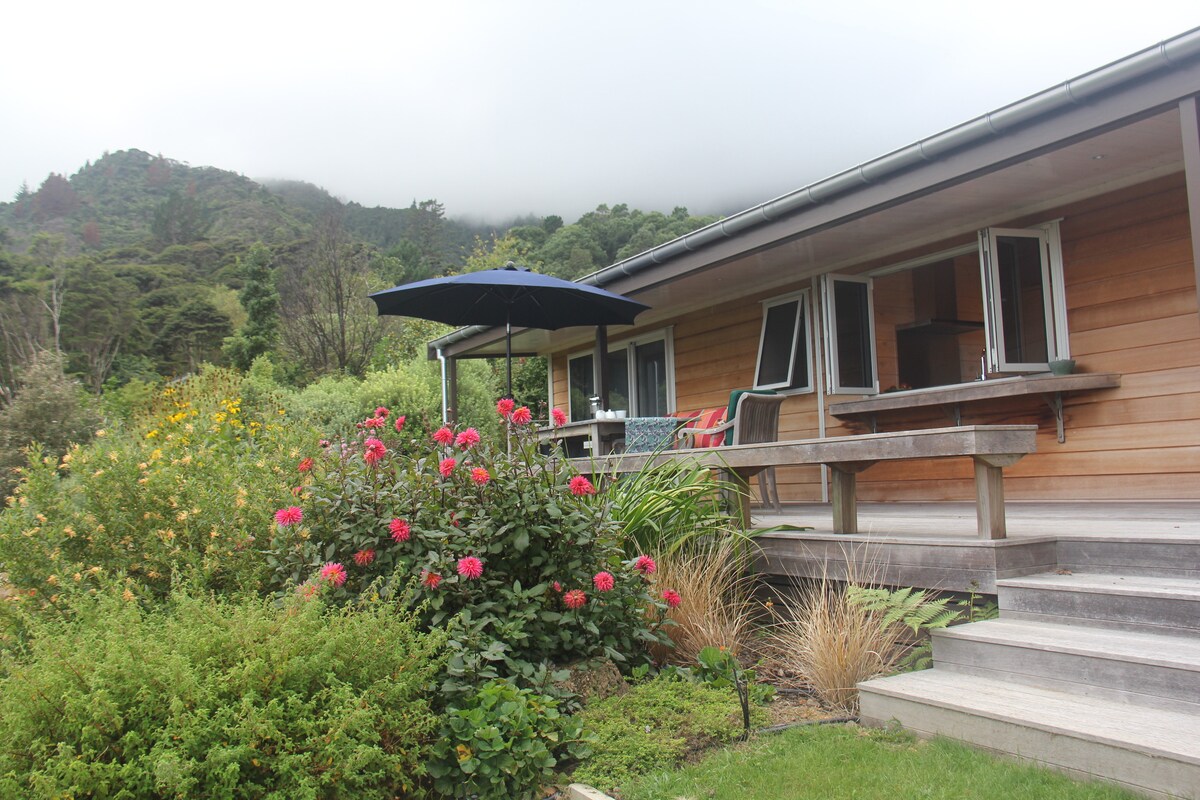 Encantadora casa de campo de 2 dormitorios con cama tamaño queen y dos camas individuales; una escapada tranquila en un entorno pintoresco y aislado, a 3,5 kilómetros del centro de la ciudad. Disfruta de tu café por la mañana rodeado de hermosos jardines, escuchando el canto de aves del nativo de Nueva Zelanda Tui y Bellbirds. Relájate por el sol por la mañana o por la tarde y experimenta gloriosas puestas de sol desde la terraza con maravillosas vistas al puerto de Coromandel y las colinas de Coromandel revestidas de arbustos.