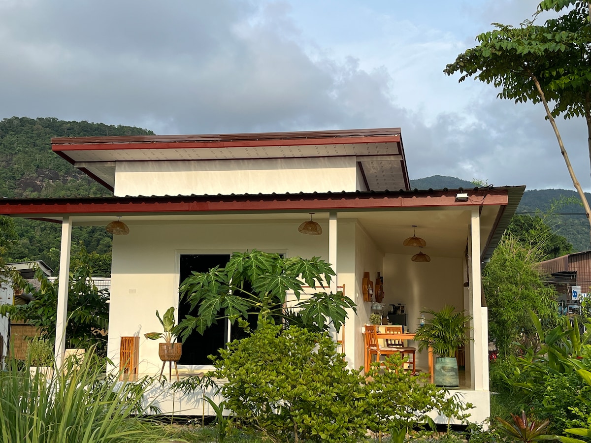 Comfortable bungalow located in a quiet resort, in a garden in Klong Prao, 200m away from the beach and 200m away from the main road. Air-condition, fridge, private bathroom with hot shower, good WiFi, TV with Netflix. Our guests have access to a shared equipped kitchen outside our reception. Cleaning on demand for free.