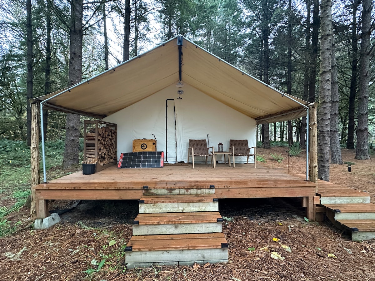 Retiro 🌿 sereno: oasis privado a 30 minutos de PDX Escapate a un santuario tranquilo en un bosque de 2 hectáreas con una tienda de campaña de pared para las 4 estaciones y una pequeña cocina. El baño privado en la casa principal está a solo 140 pies de altura por escaleras de grava desde tu carpa. Disfrutá de caminatas, ciclismo, recorridos enológicos, golf y paseos panorámicos, a solo 1 hora de la costa. Perfecto para una escapada romántica, un descanso personal o una escapada llena de naturaleza. Disfrutá del encanto rústico, las comodidades modernas, las vistas al estanque y los jardines cuidados. Reservá hoy mismo tu refugio privado.