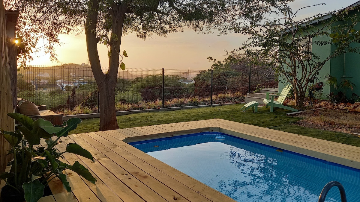 Casa Rumba es una casa grande de estilo tropical con 3 dormitorios, un amplio porche y un bar/sala de juegos. El gran porche forma el centro del espacio habitable y tiene una gran vista de Willemstad. Hay una pileta de inmersión y una ducha al aire libre en el jardín. La casa es moderna y artística en decoración y tiene una gran sala de estar, 2 baños y una gran cocina. ¿Qué hace que Casa Rumba sea especial? Es el ambiente privado relajado con diferentes áreas únicas donde vas a cenar y relajarte.