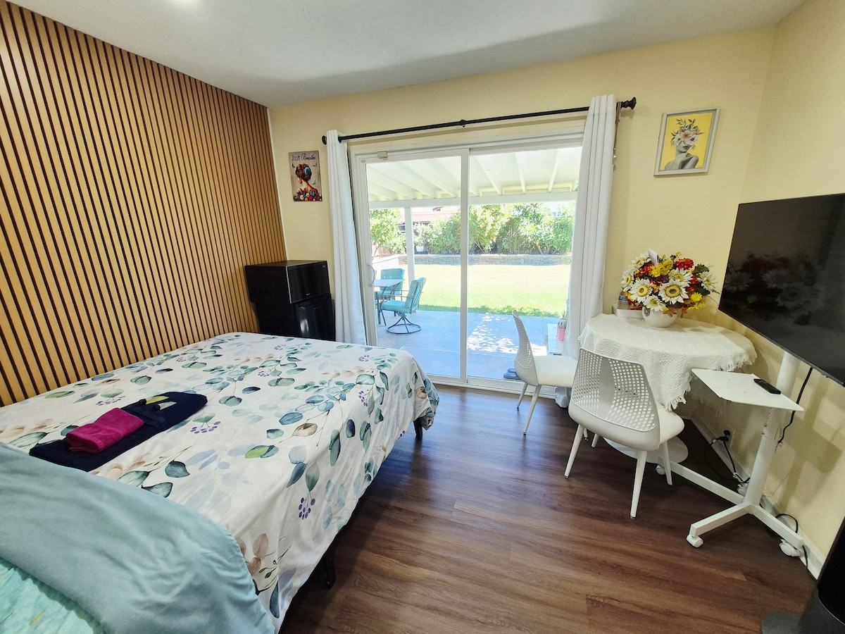 Relajate en una habitación privada y acogedora con una cama queen, sábanas limpias y tu propio baño. Disfrutá de una noche de cine única con un proyector láser 4K o sumergite en un buen libro de nuestra minibiblioteca. Vas a tener un minirrefrigerador, microondas, tetera y wifi gratis, perfecto para una estadía cómoda y autónoma. Ubicado en un barrio tranquilo cerca del Great Mall y de las principales autopistas, es un refugio tranquilo con fácil acceso a todo lo que ofrece San José.
