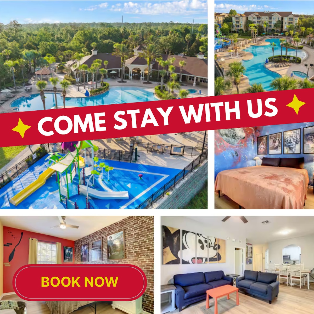¡Bienvenido🌞! Este apartamento está en el primer piso. ¡Tus merecidas vacaciones comienzan aquí 😎! Ubicado en el corazón 💗 de Walt Disney World y cerca de los mejores planes de Kissimmee y Orlando 🎢. Incluye 1 camaking y 1 sofá cama full. Ahora con BIG SMART TVs con Disney+, Netflix y Amazon Video, perfectas para relajarte tras un día lleno de diversión.✨ 🚗 ¿NECESITAS CARRO? Pregunta por nuestra minivan de 8 pasajeros. ¡Planea tu estadía y el alquiler en un solo paso!