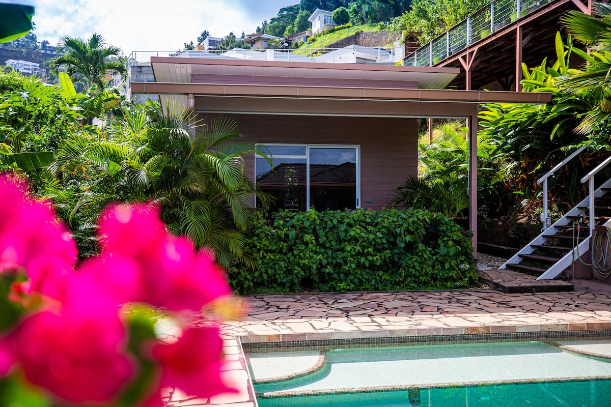 En Moorea, en la bahía de Cook, nuestro bungalow para 2 personas (BB Ok si está equipado) se encuentra en el terreno de nuestra casa familiar. Romántico, espacioso, cómodo (aire acondicionado, cama QSize, cocina, baño, inodoro, terraza privada) da a la vista de la laguna y a los espacios compartidos: jardín con piscina y espacio para barbacoa. Compartimos nuestros buenos planes, consejos, momentos con nuestra familia y nuestros grandes perros con mucho gusto. Opción de spa de burbujas disponible en su terraza privada a pedido.