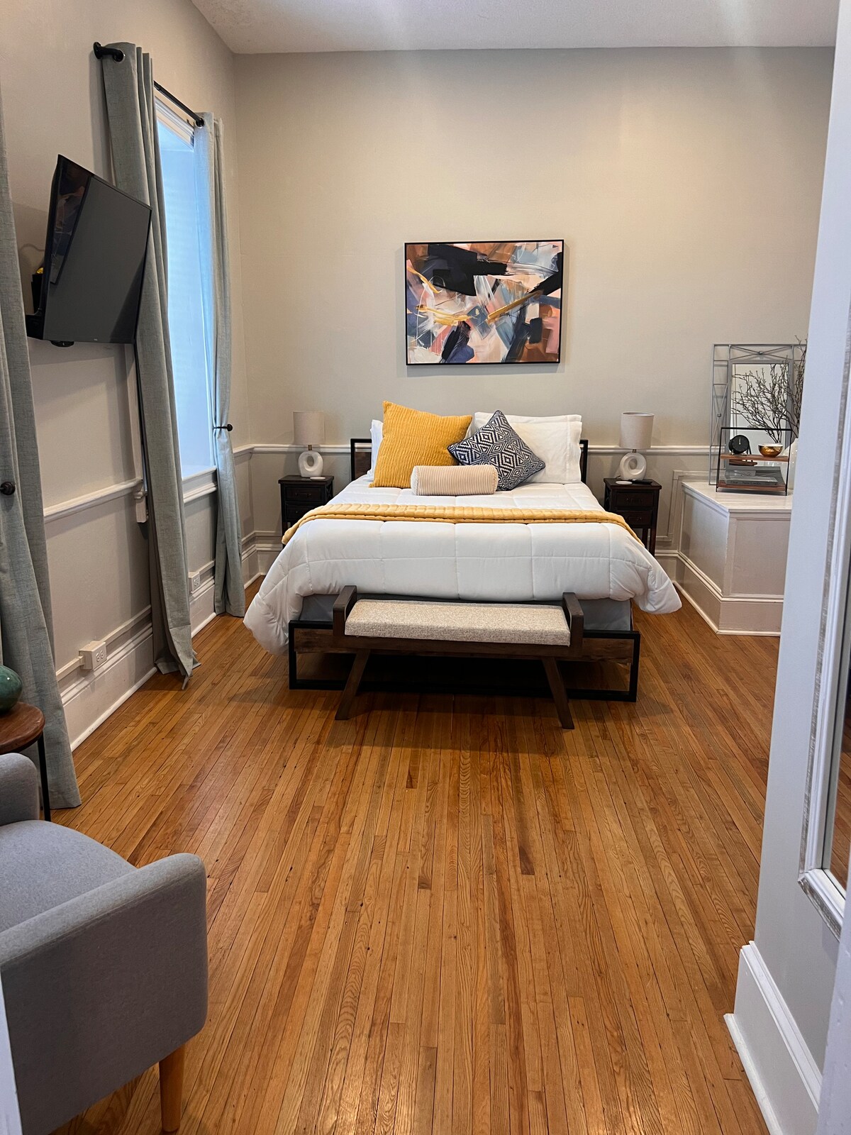 ¡Disfruta de lo mejor del centro histórico de New Bern! Nuestra acogedora suite está a pocos pasos de vibrantes tiendas, bares y restaurantes. Disfruta de impresionantes amaneceres y atardeceres junto al río Neuse, a solo dos manzanas de distancia. Viajar es fácil con el aeropuerto a 8 minutos, el hospital a 5 minutos y Atlantic Beach a solo 45 minutos en coche. Ubicada en el segundo piso de un edificio histórico de 1880, esta suite cuenta con una cómoda cama y un sofá cama. ¡Perfecta para tu aventura en New Bern!