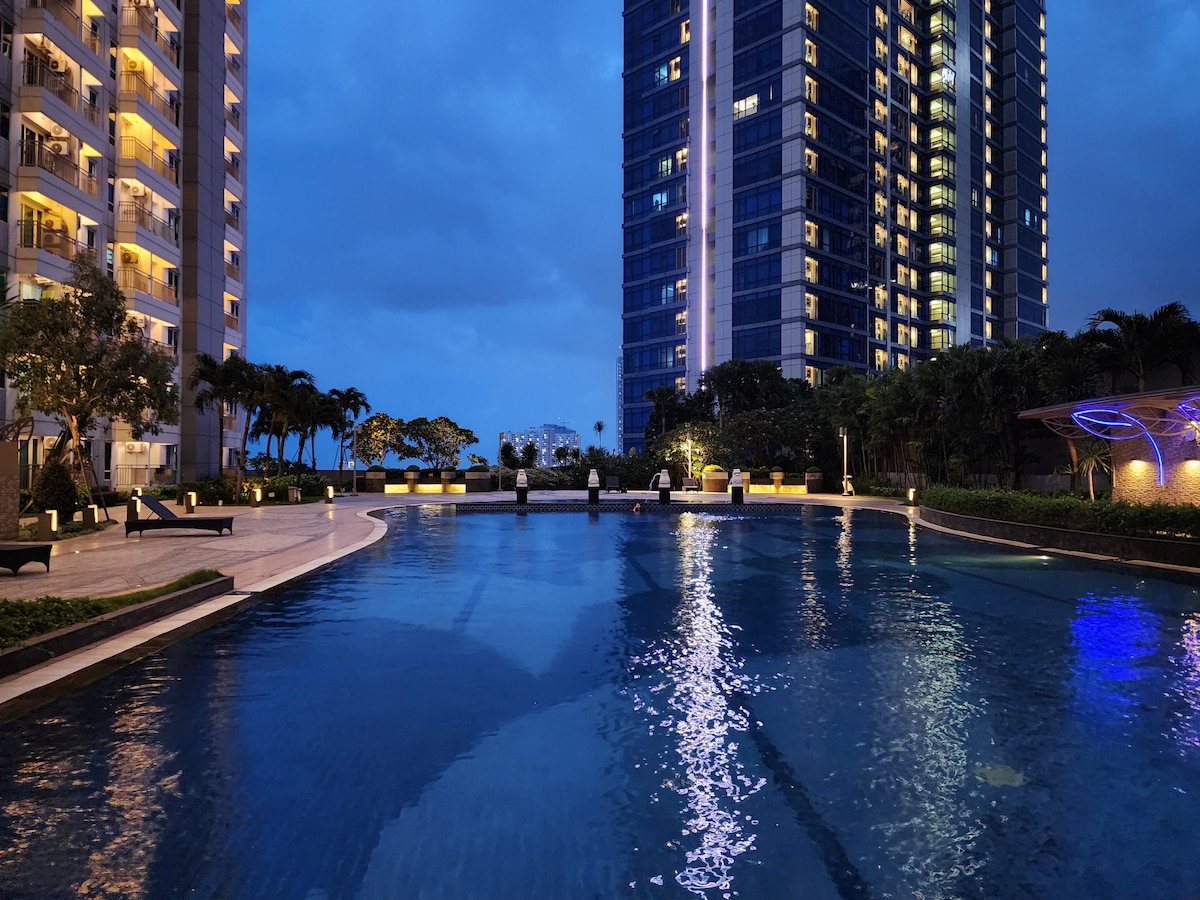 Bienvenido a Ayodya, tu tranquila escapada en el corazón de West Surabaya. Disfruta de tu estancia con la familia en la parte superior del centro comercial Pakuwon Mall Surabaya, el centro comercial más grande de Indonesia. Este apartamento elegante y cuidadosamente diseñado combina la comodidad moderna con toques suaves y lujosos para una estancia verdaderamente relajante.