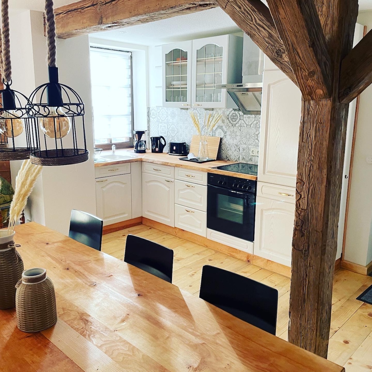 Bienvenido a nuestra Kate en Mönkebude, Kate y Meer de Mönke, en la laguna de Szczecin del Mar Báltico Nuestra Kate, protegida por un monumento junto al mar, está a tu disposición para relajarte. El Kate se construyó alrededor de 1850 como una extensión de la antigua casa de granero grande de una familia pesquera de Mönkebude y se utilizó para vivir hasta alrededor de 1982. Hoy en día, nuestros huéspedes se recuperan entre las antiguas paredes de entramado de madera hechas de ladrillos, paredes de yeso de arcilla y debajo del hermoso techo de Reeth en unos 80 metros cuadrados de espacio habitable.