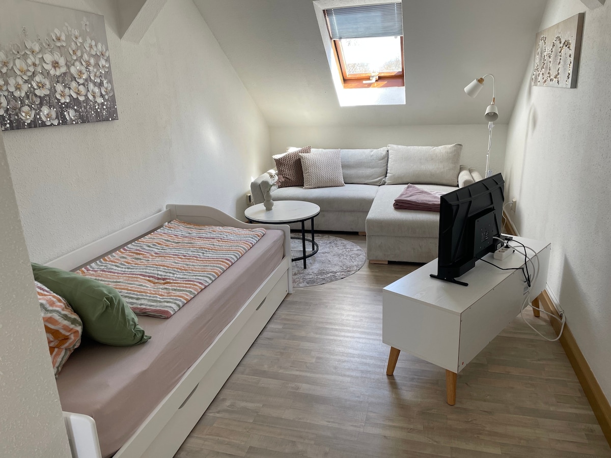 Nuestro departamento está en una casa familiar en el sótano con una entrada independiente. El dormitorio está amueblado con una cama de resortes (mantas extralargas de 220 cm), caja fuerte, persianas para el auto, portaequipajes. El living se divide en sala de estar, cocina y comedor. La cocina está totalmente equipada con microondas, horno, lavavajillas, cafetera, hervidor de agua, tostadora, ollas de alta calidad, etc. Hay WLAN, radio con Bluetooth y TV disponibles. Incluye estación de trabajo con laptop.