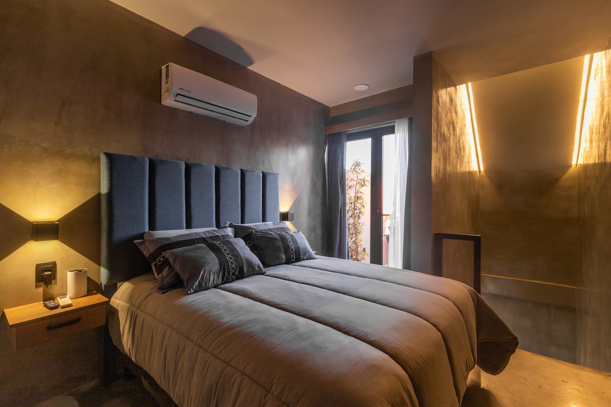Departamento tipo loft estilo moderno-mexicano, totalmente amueblado, con aire acondicionado, 1 cama matrimonial, sala con sofá cama, closet, baño completo, cocina integral, comedor, smart TV, internet en el departamento y en areas comunes, lavadora y secadora de uso común, areas verdes, servicio a domicilio de restaurantes de la zona y excelente ubicación dentro de la Plaza Luna Lima.