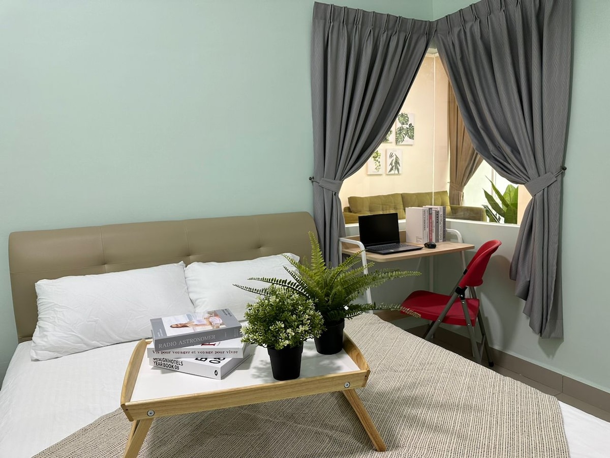 Disfruta de un cómodo retiro en esta suite. Apartamento estudio Muji con baño privado, cocina pequeña y lugar de trabajo adecuado para parejas y familias. Renovado con diseño de tatami de madera, acabados de alta gama y armarios. Un espacio encantador para relajarse después de un ajetreado día, ya sea de trabajo o de juego. A menos de 20 minutos en coche de KLIA/KLIA 2/Mitsui Outlet. A poca distancia a pie de una variedad de restaurantes y tiendas de comestibles como 711, Starbuck, lavandería, comida tailandesa e incluso una clínica 24 horas y un puesto de mamak.