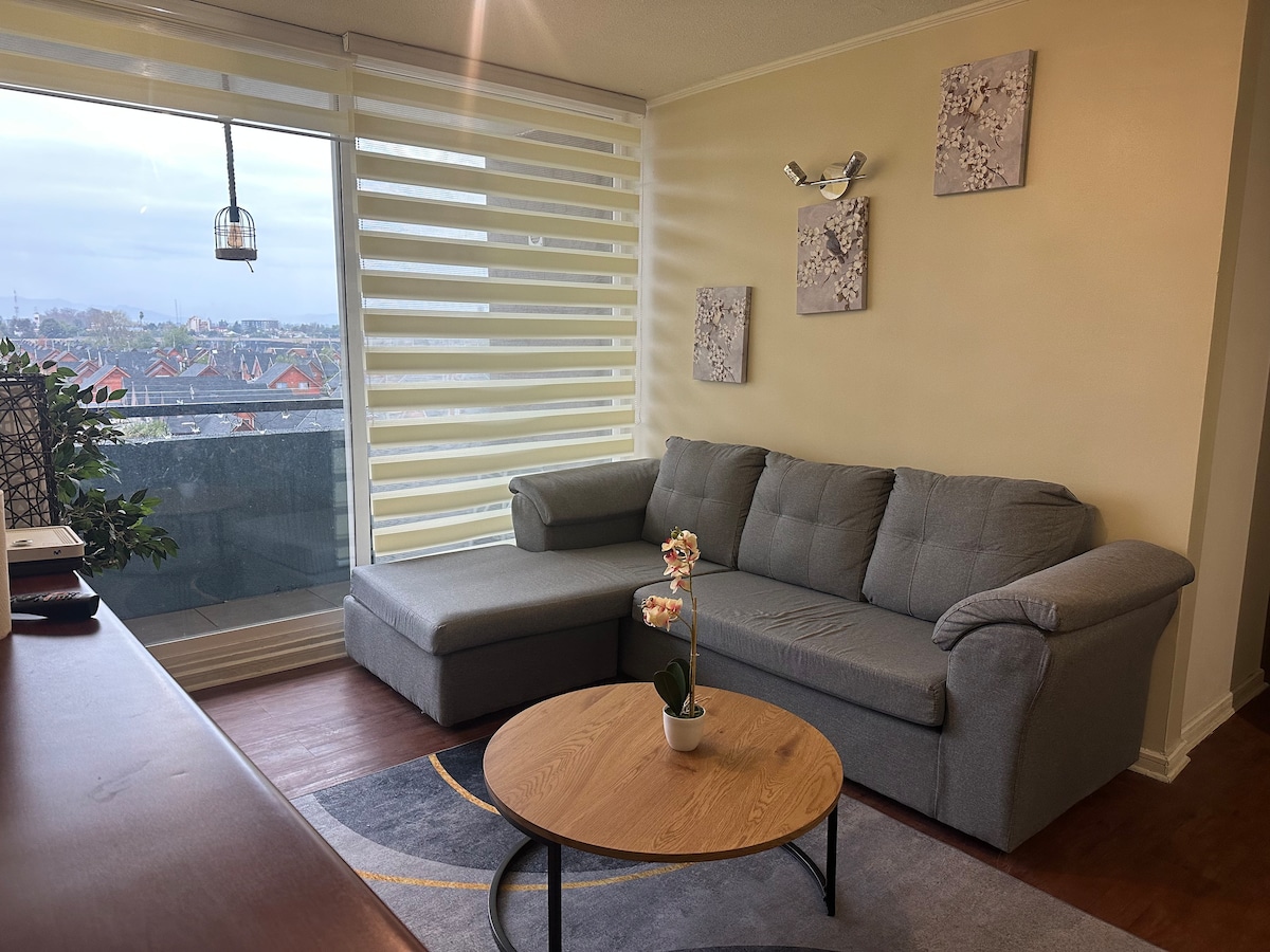 Depto con full equipamiento nuevo, cuenta con Wi-fi, TV y Apps, aire acondicionado y todo lo necesario para una estadía tranquila y confortable. Se encuentra en un 4to piso (sin ascensor).Ubicado en condominio nuevo, con áreas verdes, quincho, estacionamiento privado, seguridad 24/7, locomoción a la puerta y acceso reservado solo a residentes. Cercano a supermercados, a 15 minutos de la ruta 5 sur, a 5 minutos del centro de la ciudad y hospital, de fácil acceso a lugares turísticos de la zona.