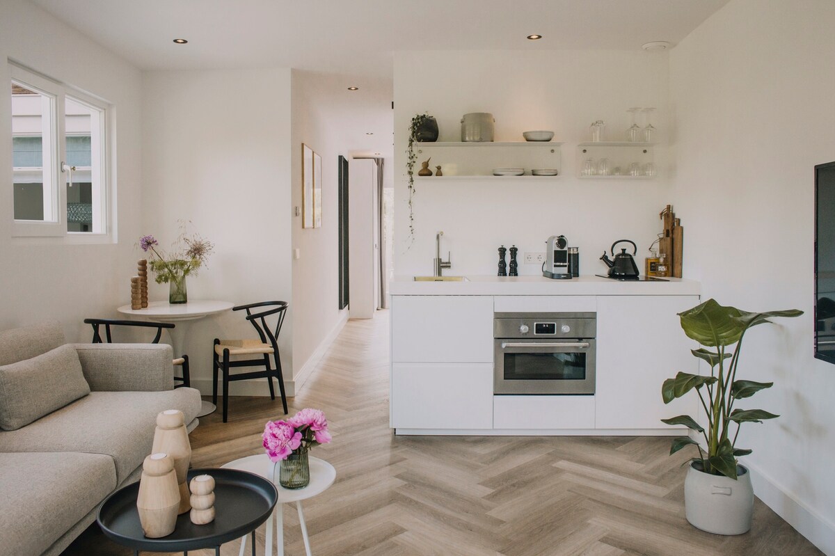 Mejora de lujo 2022! Cosi habitación boutique privada con dormitorio y isla de cocina cerca del mar, el centro y la estación de tren. Sistema de calefacción por suelo radiante y cocina con placa de inducción, nevera y microondas combinado. Baño con ducha a ras del suelo. A solo 500 metros del mar y a 50 metros del restaurante e ir de compras. Hay un patio privado disponible para desayunar/cenar al aire libre. El jardín se puede cerrar y el jacuzzi (39 ° C) y la sauna se pueden reservar durante una parte del día.
