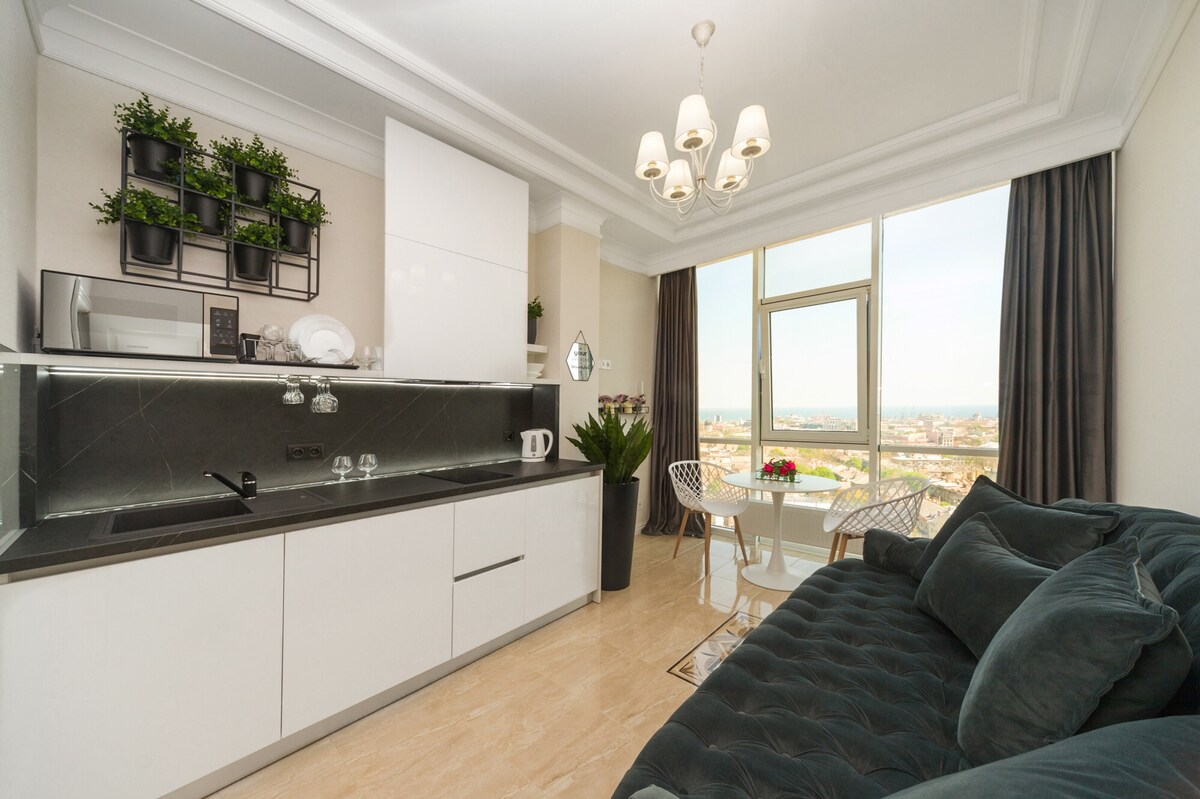 Vista panorámica al mar y a la ciudad | Apartamento elegante | Ubicación ideal ¡Bienvenido a La Rose Apartment, tu acogedor rincón panorámico en el corazón de Odessa! El apartamento está situado en la planta 18 de un edificio moderno y ofrece unas vistas impresionantes del mar Negro y del horizonte de la ciudad a 180°. A solo 10 minutos a pie, se encuentra la famosa calle Deribasivska, cerca de los mejores cafés, tiendas y la playa. Un lugar ideal para disfrutar de todo lo que ofrece.