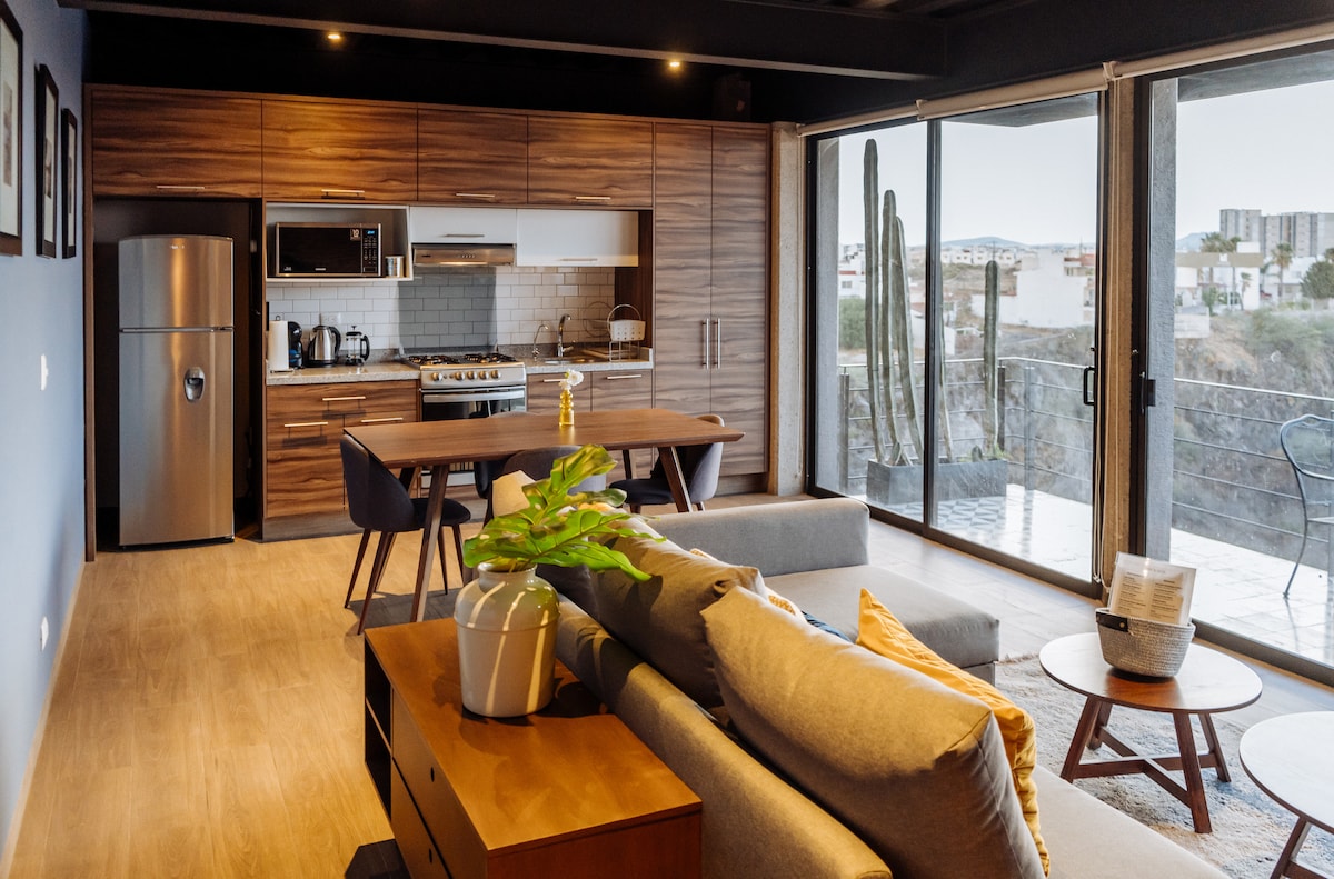 ¡Descubre las vistas más impresionantes de Querétaro! desde este moderno departamento de estilo industrial. A solo 10 minutos del centro, disfruta de increíbles panorámicas tanto de la ciudad como de la montaña. Perfecto para grupos de hasta 6 personas. Es ideal para viajes de trabajo o placer por el fácil acceso, comercios y la posibilidad de facturar tu estancia. Las habitaciones cuentan con aire acondicionado y calefacción. Experimenta la comodidad que este departamento te ofrece.