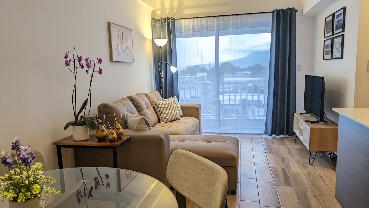 Disfruta de vistas espectaculares e inigualables a los volcanes desde el balcón en este moderno estudio. El apartamento esta esta 100% equipado con amenidades de alta calidad. Desde una cama queen y un sofá cama, hasta una cocina totalmente equipada y cortinas blackout. Incluye un espacio de estacionamiento, acceso al gimnasio y a la tienda de conveniencia del edificio. A solo 8 minutos del aeropuerto, es el lugar perfecto para ti